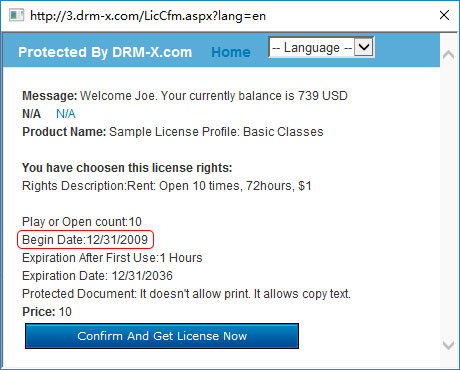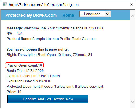 DRM-X 3.0 provides sophisticated rights and permission settings to determine who can access the protected content and under what terms. You can totally control rights and permissions with user's money, rights price, play count, begin date, expiration date and so on.