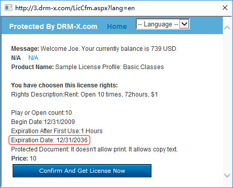 This information appears on the license acquisition window before the end users click the Confirm and Get License Now button. You can also view it in Haihaisoft PDF Reader, click File- >DRM Property.